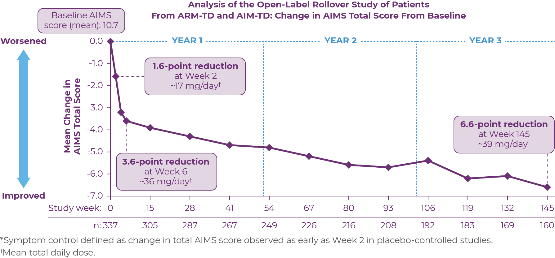 AUSTEDO was shown in 2 pivotal trials to result in rapid and significant symptom control as measured by changes in patients' AIMS scores, and comparable results were observed in a long-term study of ~3 years.14-16